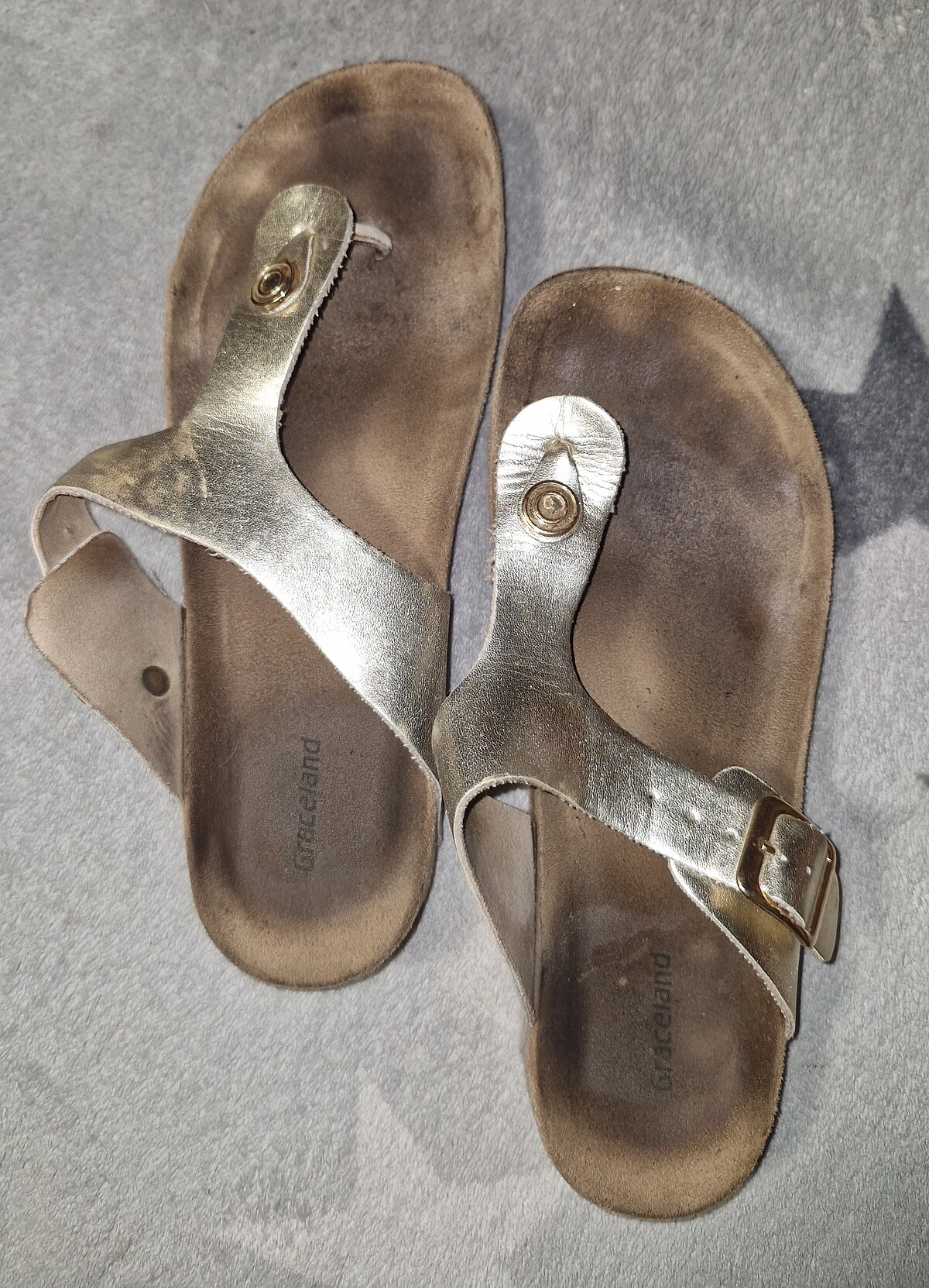 Diese goldenen Riemchen-Sandalen wurden von mir bis an ihre Grenzen getragen und sind nun bereit für einen neuen Besitzer, der ihre wahre Geschichte zu schätzen weiß.